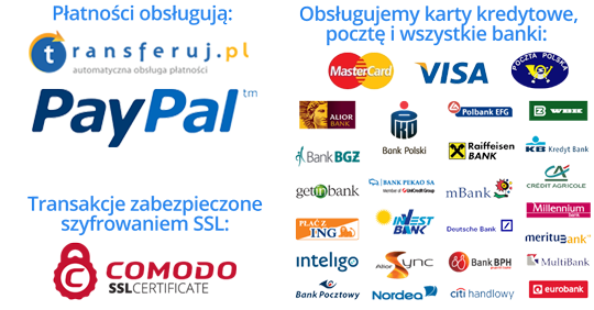 Twoja transakcja jest obsługiwana przez uznane płatności on-line, tPay, PayPala, Visę/Mastercard lub Twój bank, my nie przechowujemy danych o transakcji. Ponadto wszystko jest zabezpieczone połączeniem szyfrowanym i certyfikatami, więc możesz spokojnie złożyć zamówienie.